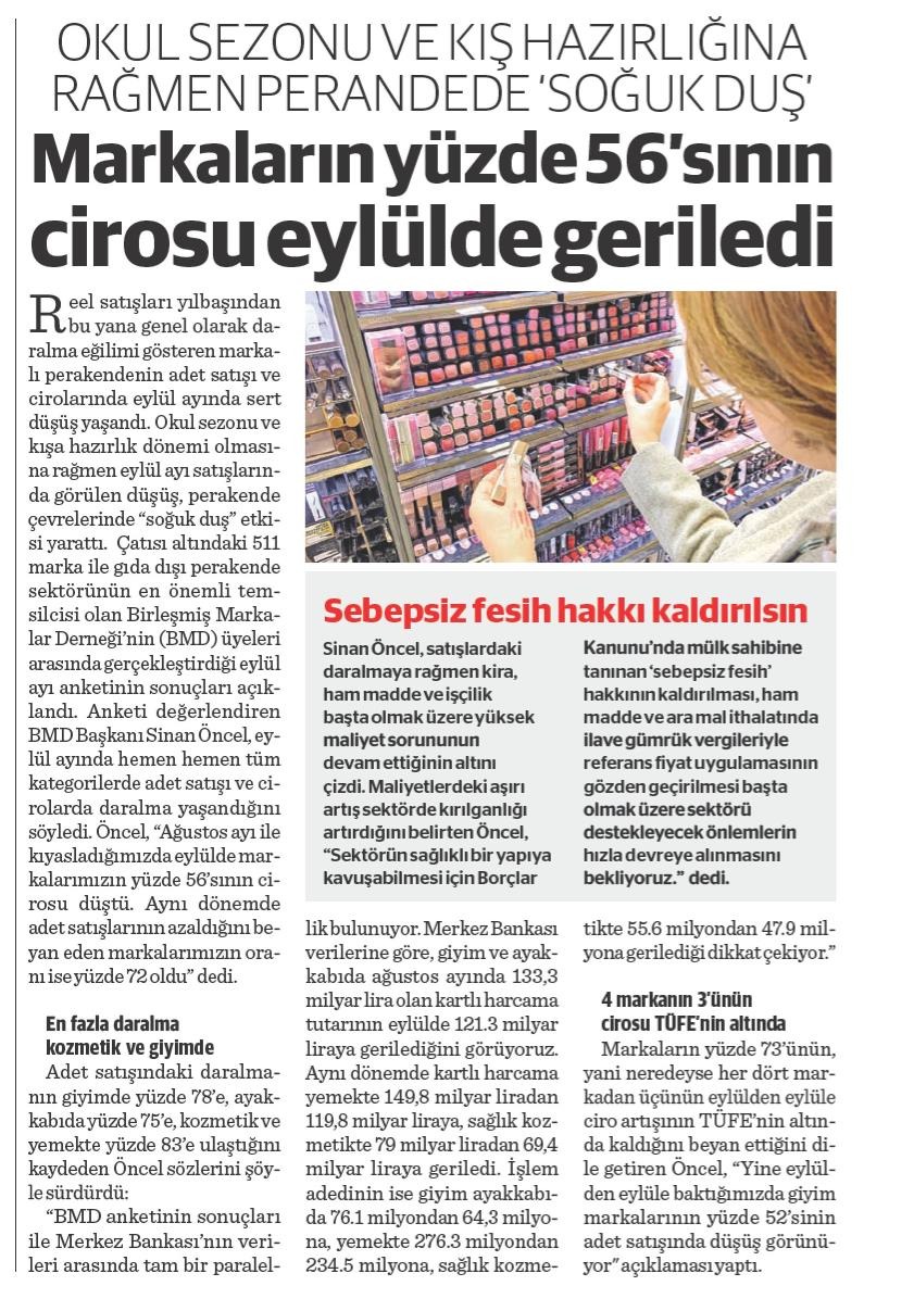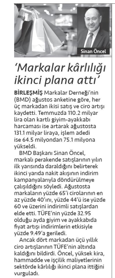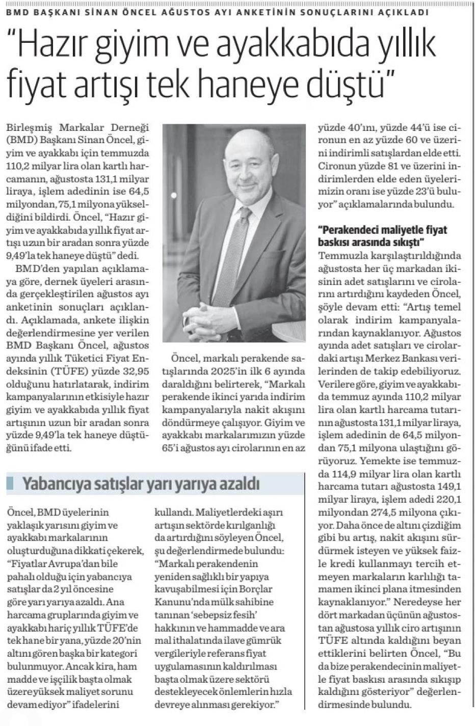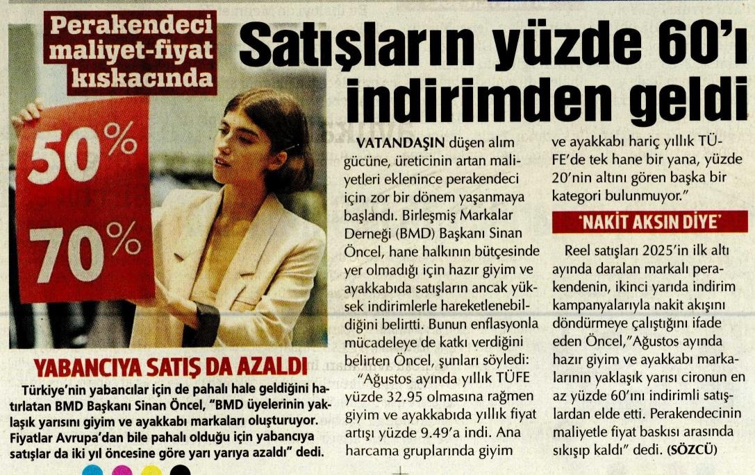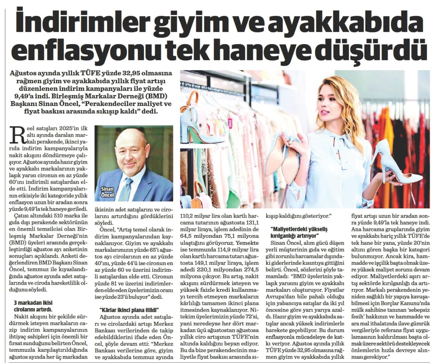 BMD Başkanı Sinan Öncel: Hane halkının bütçesinde yer olmadığı için hazır giyim ve ayakkabıda satışların ancak yüksek indirimlerle harekete geçmesi enflasyonla mücadeleye de katkı veriyor. Ağustos ayında yıllık TÜFE yüzde 32,95 olmasına rağmen giyim ve ayakkabıda yıllık fiyat artışı yüzde 9,49’a indi. Ana harcama gruplarında giyim ve ayakkabı hariç yıllık TÜFE’de tek hane bir yana, yüzde 20’nin altını g&o...