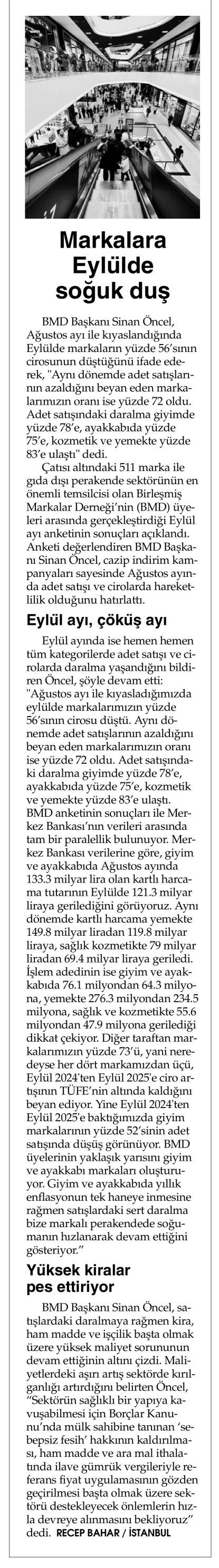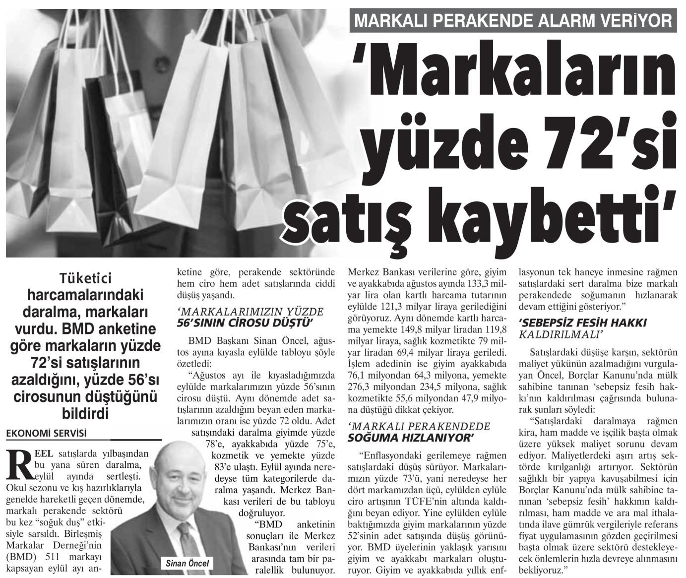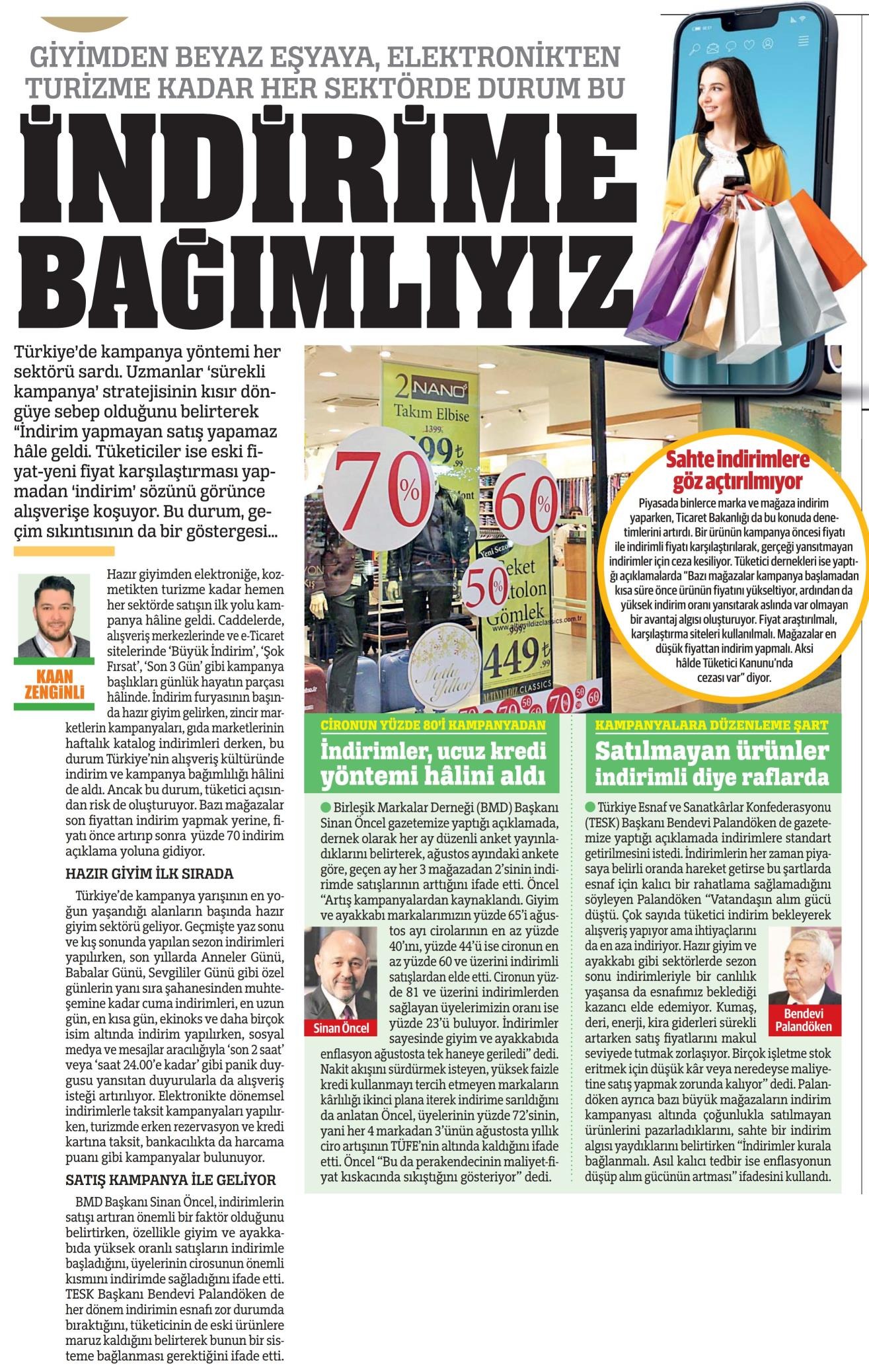 BMD Başkanı Sinan Öncel: Hane halkının bütçesinde yer olmadığı için hazır giyim ve ayakkabıda satışların ancak yüksek indirimlerle harekete geçmesi enflasyonla mücadeleye de katkı veriyor. Ağustos ayında yıllık TÜFE yüzde 32,95 olmasına rağmen giyim ve ayakkabıda yıllık fiyat artışı yüzde 9,49’a indi. Ana harcama gruplarında giyim ve ayakkabı hariç yıllık TÜFE’de tek hane bir yana, yüzde 20’nin altını g&o...